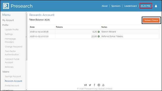 و في كل مرة تقوم بالبحث فيها عن أي معلومة باستخدام الموقع و سيعطيك 0.25 من عملته و في كل يوم لديك 32 مرة للبحث أي 8 قطع من العملة في اليوم أي 2.16 دولار يوميا , و من أجل سحب الأرباح يجب الوصول الى 1000 قطعة من العملة فقط و ذلك بالنقر على الرصيد من الأعلى ثم الضغط على Redeem Tokens.