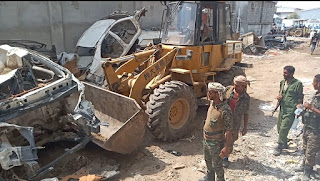 جاء ذلك ، خلال تنفيذ السلطة المحلية بمديرية المنصورة ، في يومها العاشر ، من أعمال الحملة الأمنية الواسعة لإزالة الأكشاك والبسطات العشوائية واللوحات الإعلانية والمظلات الغير مرخصة ورفع هياكل السيارات في عدد من مناطق المديرية ، والتي واصلت أعمالها ، اليوم " الأحد " ، لليوم الرابع على التوالي ، في المنطقة الصناعية بالدرين ، بحضور مدير شرطة الدرين ، العقيد / محمد قائد عقيبه ، وقائد طوارئ كتيبة الإحتياط الثانية بقوات الحزام الأمني - قطاع المنصورة - الملازم / عبدالصمد فرج العمري ، ونائبه العريف / طه حسين العمري .