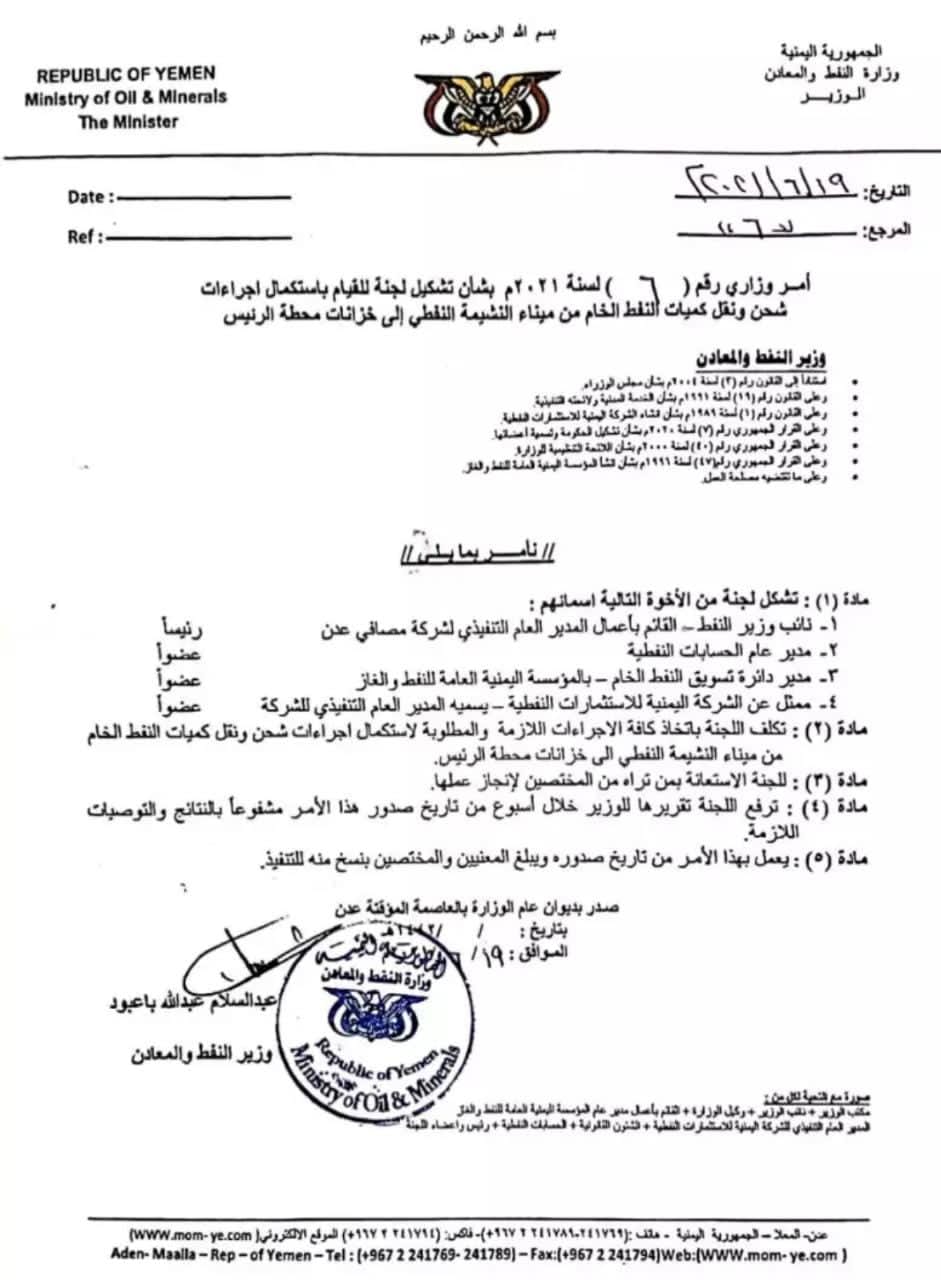 ولفتت المصادر إلى أن اللجنة المشكلة بقرار وزير النفط والمعادن الدكتور عبدالسلام باعبود والتي يرأسها الدكتور سعيد الشماسي نائب وزير النفط القائم باعمال المدير التنفيذي لشركة مصافي عدن وعضوية عدد من الكوادر المختصة في الوزارة والمكلفة بتزويد محطة الرئيس بالوقود قد استكملت الترتيبات الفنية الخاصة بنقل الوقود الخام من ميناء النشيمة الى المحطة.