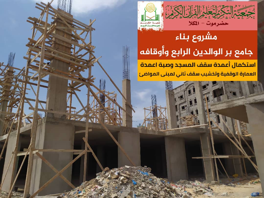 استأنفت جمعية التكريم لتعليم القرآن الكريم العمل في مشروع بناء جامع بر الوالدين الرابع وأوقافه بخط 40 شقة مدخل الكود حي النصر ، حيث العمل جاري في استكمال أعمدة سقف المسجد وصبة أعمدة العمارة الوقفية وتخشيب سقف ثاني لمبنى المواضئ تحت إشراف مباشر من مكتب المهندس عمر مبارك عصبان للهندسة والمقاولات،